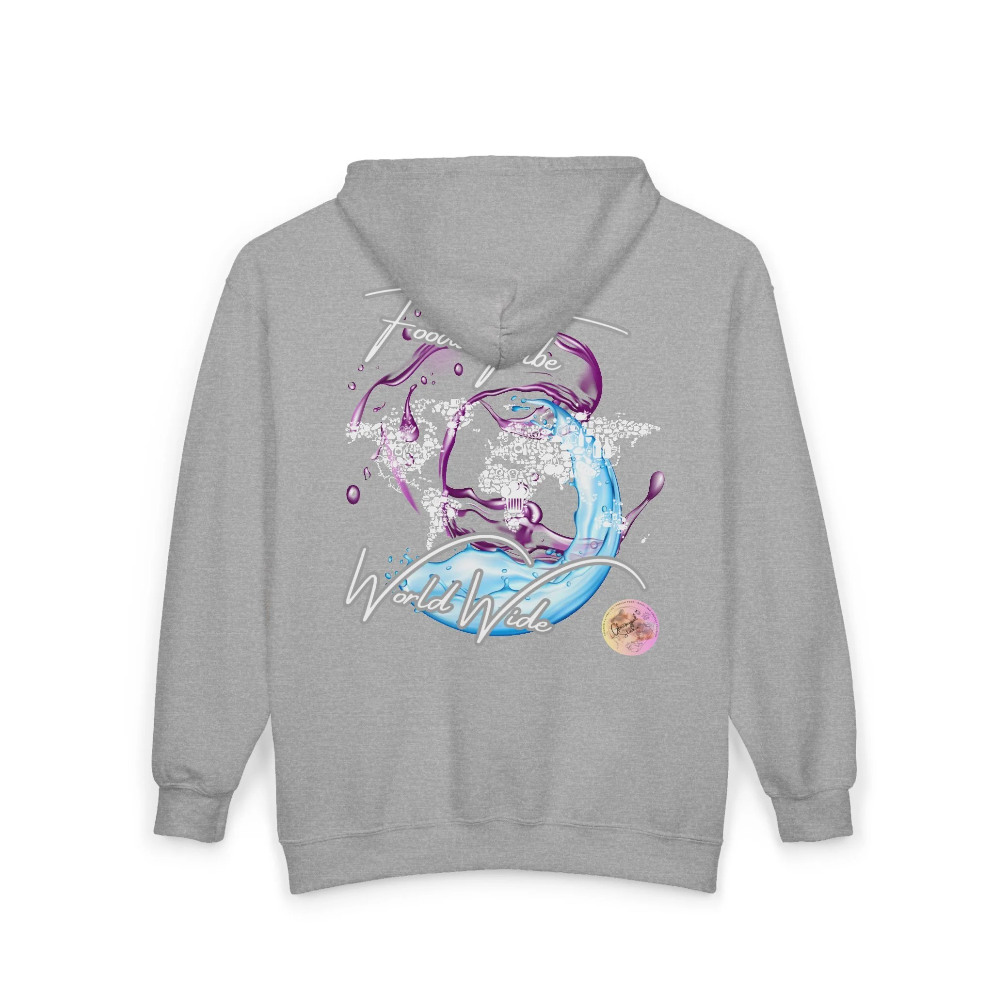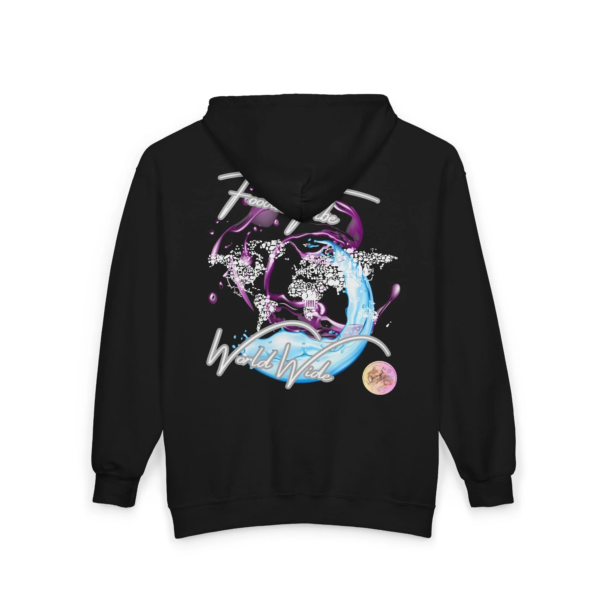 This zip-up hoodie blends everyday comfort with dreamy, cosmic streetwear. The washed-black background makes the watercolor-style world and wave graphics pop—soft pastels swirl around a small planet and handwritten script, giving the design a nostalgic, late-night-surf aesthetic. The roomy pockets and full metal zipper keep it practical; the medium-heavy 50/50 fabric holds shape while feeling substantial and warm. Wear it over a tee between studio sessions, on a moonlit walk, or layered for a roadtrip stop at a coastal lookout. The vibe reads like a playlist: quiet, reflective, and a little electric.